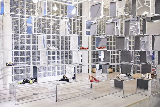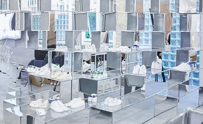 刚才介绍这么多美鞋和博主。最重要空间还没有提及。这是一幢藏在公园深幽处的两层玻璃房子,LOOK与好处MeetBest及景鹄文化合作,联合知名设计师熊星对这进行了一番改造,由700个亚克力镜面,1200根金属杆,300平米的大型装置艺术,把微信号+小程序商店的链接,复刻到线下三维空间。成为了“方格镜面即为像素,书写线上的文本与图形;像素错动即为展架,加载商品实物。”的艺术装置空间,美轮美奂。