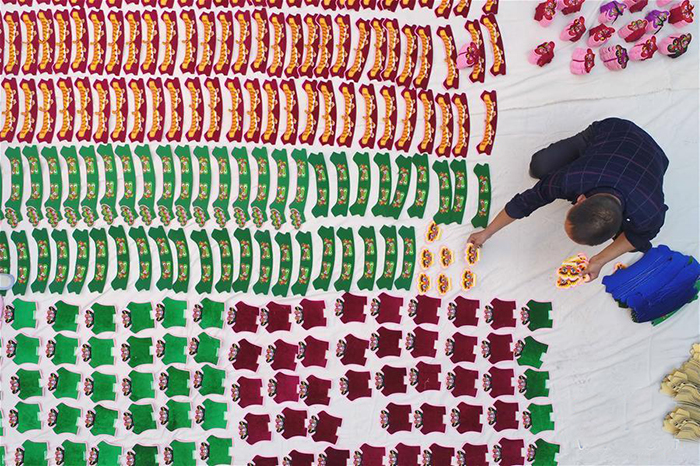 【-市场资讯】河北省任县三北张村村民在晾晒虎头鞋部件。当日是二十四节气中的立冬。在河北省任县,不少乡村手工艺人都会在立冬后大规模加工缝制虎头棉鞋。