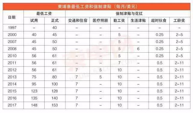 柬埔寨基本工资和强制津贴