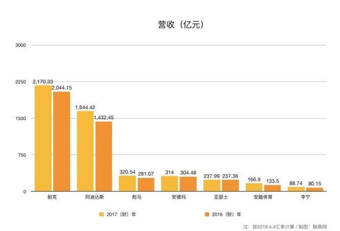 安踏体育2017年营收166.9亿元,同比增长25.1%,净利润30.9亿元,同比增长29.4%,创最好企业绩。2017全年,安踏集团总共销售超过6000万双鞋;超过8000万件衣服;有超过10000家门店;突破1000万会员;直接创造就业超过10万人。安踏的市值突破1000亿港币,位居全球行业第三位。