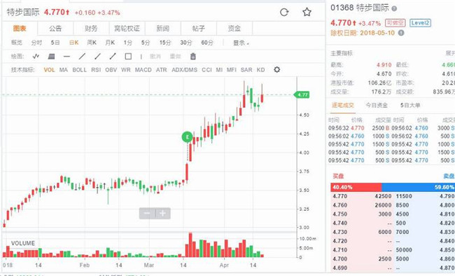 【-行业新闻】18日讯,上周连续上涨三日,盘中股价一度创近一年新高的特步国际(01368.HK)后续几个交易日出现回调,股价连跌四日,今日又见反弹,盘中一度涨超6%,现最新报4.77港元,涨3.47%,暂成交740.44万港元,最新市值为106.5亿港元。