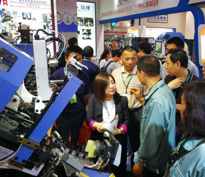 小巧精细、技术先进的台湾鞋机一直颇受业界青睐。图为参观者聆听台湾诚锋机械销售人员讲解最新设备。