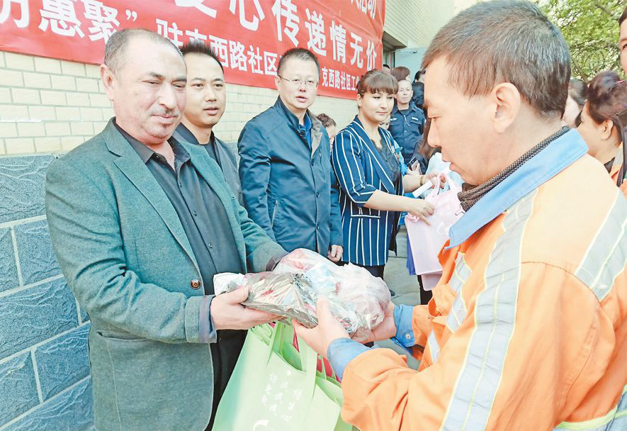 【-鞋情话意】4月30日,克西路社区烧烤店店主(左一)阿不都热依木·依明自掏腰包,购买了300双鞋,送给辖区环卫工。