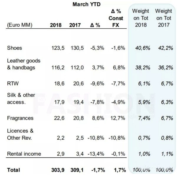 截至3月底的一季度,菲拉格慕集团销售录得1.7%的跌幅,由3.091亿欧元跌至3.039亿欧元,固定汇率计算有1.7%的增幅。