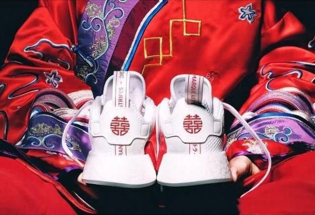 提到对中国风有误解的球鞋,每年的中国新年一定是重灾区。各大品牌怎么会放过这一个捞金的好机会?纷纷推出中国新年限定。今年作为狗年,各大品牌也照常推出了限定款,可是有些确实有些难以理解。首先是Adidas,以白色NMD R2为蓝本,用鲜红喜庆的 “囍” 字标志呈现,红色的鞋垫以烫金呈现同样的标志 ,虽然充满浓郁中国味道,但总感觉有点奇怪。