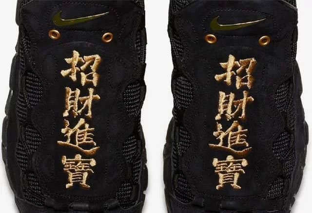 另一边,Adidas的老对手也没有坐以待毙。在今年的大年初五发布了一双Air More Money “LNY” ,以More Money为主题,结合中国传统佳节打造。鞋身以纯黑色打造,鞋面则以金色刺绣写着“招财进宝”繁体字,后跟加入乾隆通宝钱币图案。