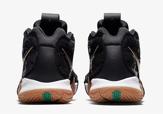 除此之外鞋身后段也有象是泼墨一般图样,是此版本独特的细节,而胶底 Z 字形凹槽的绿色就象是塞尔提克全队同心协力面对季后赛一样,显示出 Kyrie Irving 目前所效力的队伍。此款 Kyrie 4 目前发售。