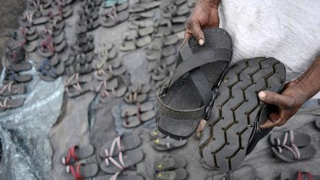 以废弃轮胎制成的鞋子。