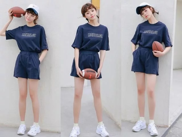 运动鞋+运动装的搭配,是最经典的CP,偏爱运动风的你,这款千万不要错过了,简约的蓝色上衣,看上去元气少女范,小圆领的设计,大方优雅,撞色字母印花,让上衣增添了不少时髦感~下身是一条同色系的休闲短裤,同色系的搭配,轻松打造显高的效果,整体宽松的款式,不怎么挑身材穿,随意搭配运动鞋就很好看了,这么一套运动风套装,这个夏季运动的季节,就要动起来,谁穿谁好看哦~