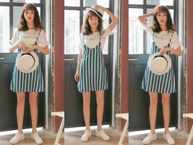 经典的运动鞋,百搭时髦,怎么穿都不会过时,还很好看的哦,大大V领的吊带裙,尽显性感魅力还很女人,小吊带的结合,凸显身材曲线,白绿竖条纹的设计,视觉上有拉长身材比列的效果,矮个子穿上很显高挑身材哟,微A字版型,藏肉显瘦不用多说,内搭简约白色T恤,爱心印花装饰,甜中带带点美feel,整体造型那么的甜美,那么的时髦好看~
