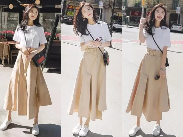这是一眼上去就很高挑身材又好看的搭配,简约的白色T恤,这个夏季穿上清纯又简洁,搭配高腰设计的半身裙,A字版型,巧妙地遮住多余的肉肉,拉长腿部比例,还特显高的既视感,腰身同色系腰带装饰,收腰显瘦,这么一套时髦显气质的搭配,怎么能少得了时髦的运动鞋,外搭双运动鞋,休闲又优雅大方~