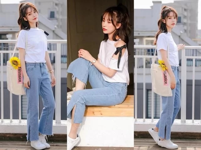 这是今天为大家介绍的最后一款运动鞋时髦的穿搭,挖肩T恤配上黑色丝绸绑带的设计,上身性感时髦太多了,很显气质的款,经典圆领,彰显出迷人的锁骨线条,很显脸型,简约的纯色系,夏季再适合不过的了,清爽感倍增,搭配经典的牛仔裤,谁穿都好看的搭配,外搭双运动鞋,运动风与时尚风的结合,撞出时尚潮流范~