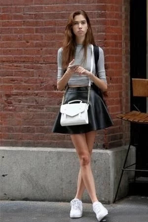 勾当鞋搭配示范:灰色针织衫+黑色半裙+勾当鞋