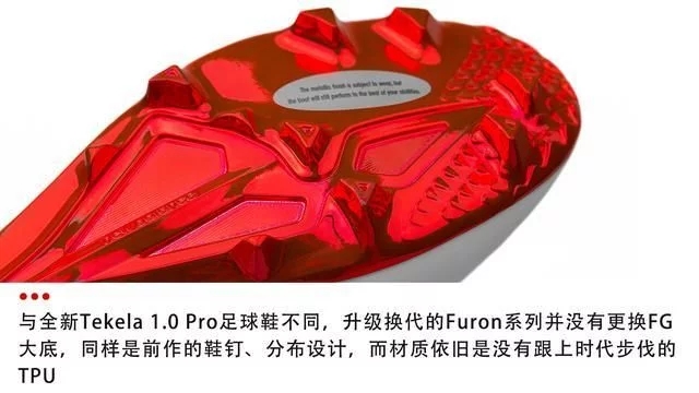 新一代Furon战靴所使用的FG大底与前一代相同,这款大底的鞋钉形状、分布和长度都非常有特点。而对中国业余球员来说,这款FG大底在人工草球场上的适应性非常不错。但是,鞋底的材料依旧是TPU材质,再加上全中底的设计,Furon 4.0 Pro足球鞋还是没能完成减重从而跻身一流速度型战靴的领域。