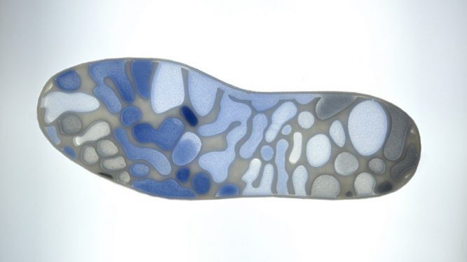 这双训练用的鞋子,会根据使用者脚步生物状态、环境的变化,而实时发生反应。鞋子的上半部是一个被细菌填充的模具,根据使用者脚部温度的变化,细菌会吃掉不同的物质,创造出一个独特的空气通道。