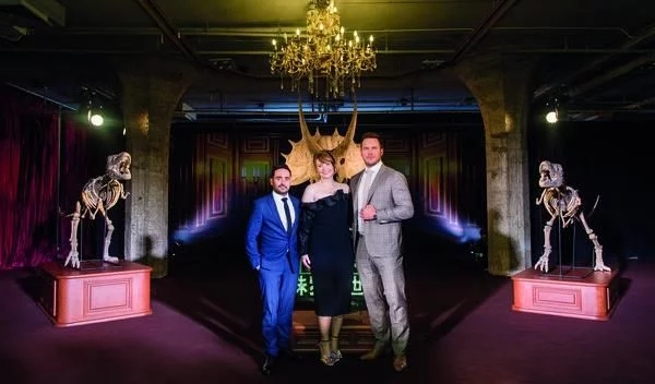 ▲《侏罗纪世界2》上海记者会现场男女主角还原剧中火山逃命片段。