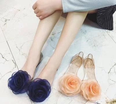 这款水晶果冻凉鞋有着十分好看的玫瑰蓝色,大气的花朵让你看起来更加时尚。透明的鞋身使你的脚看起来更加小巧玲珑。