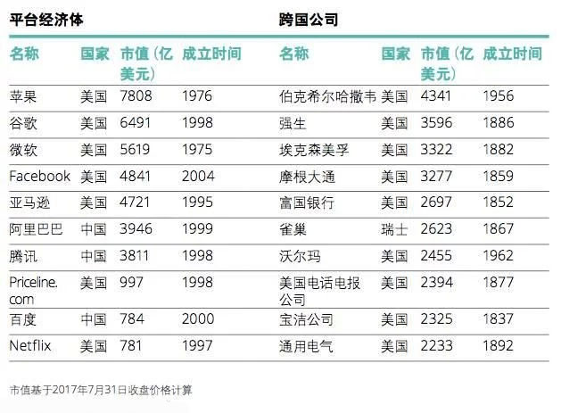 截止至2017年7月,全球十大平台经济体市值已经超过十大传统跨国公司,其中中国公司占三席。