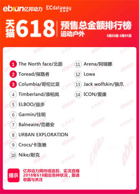 运动户外预售总金额排行榜显示,排在前三位的分别为The North face/北面、Toread/以及Columbia/哥伦比亚。