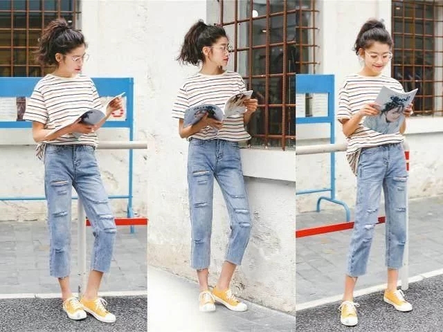上面是夏季流行穿破洞九分裤,搭配平底鞋轻松显高,速速get。