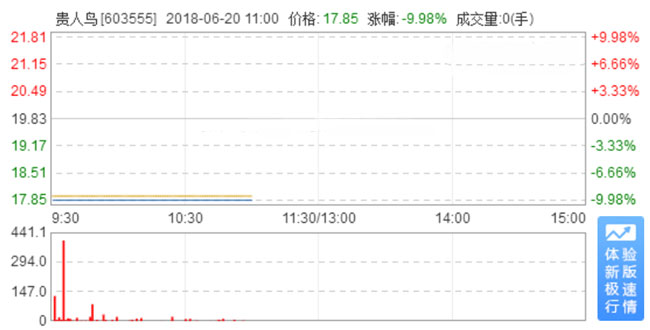 今天(6月20日),开盘报17.85元,截止11时,该股跌9.98%报17.85元,封上跌停板。这是继6月14日,贵人鸟股票出现异动后,连续第四天股票跌停。
