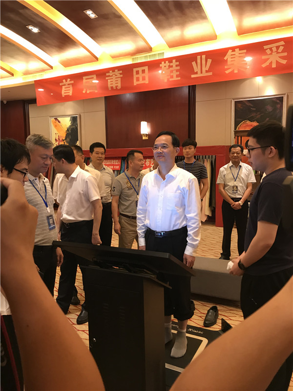 活动现场,莆田市委林宝金书记在双驰董事长陈文彪陪同下,对个性化定制识足鸟脚型测量仪进行了体验,这黑科技设备听说仅需数秒就可获取用户的足长、足宽、足高、足压等多个纬度的数据,为用户创建一个私人的脚型数据库,根据数据从个人喜好、款式、颜色、到个性化签名等,对喜欢的鞋样进行DIY选择,最快30分钟可拿到成品。市委书记和奇美董事长等各个企业领导们体验后对这黑科技充分的认可和肯定,表示对莆田鞋企未来有更好的期许。