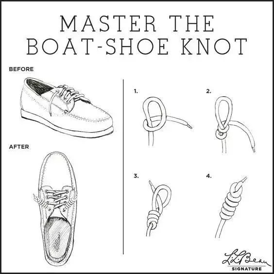 最后送上帆船鞋的鞋带绑法。这一绑法很特别,因为经常会触及到海水,也为了不让它这么快腐烂以及耐用,所以就诞生了这样的方法。一般帆船鞋的鞋带是皮质的,呈圆柱体,用一般的系球鞋鞋带方法是不可行的,只能用一种“毛毛虫结”来系。在购买新鞋时,出厂就已经绑好,不过用久了也会松掉。