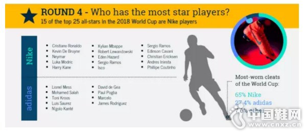 球队表现方面,本届世界杯风头最劲的法国、巴西皆在耐克麾下,克罗地亚、英格兰因为处于整体实力偏弱的下半区,也有很大机会竞争决赛门票。