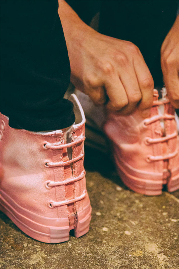 -品牌动态】中国时装设计师王逢陈不久前在纽约男装周上发布了 Feng Chen Wang 2019 春夏系列,以 “另一半” 为本季的关键词,探讨人与人之间的关系。为了配合该主题,Feng Chen Wang 特意打造了一系列定制的CONVERSE Chuck 70 球鞋,只见设计师将鞋拆卸出鞋底、后跟等 “零部件”,经过着色后再将其结合在另一双完整的鞋面上,形成一种合二为一的视觉效果。