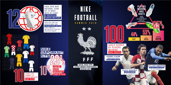 尽管不是官方赞助商,但 在本届世界杯上也取得了出色的成绩。决赛的对阵双方法国和克罗地亚均是 Nike 所赞助的球队,另外根据品牌给出的数据,在本届杯赛上穿 Nike 足球战靴的球员总共完成了 100 粒进球。在这些球员中包括了金靴奖获得者哈里凯恩 (英格兰)、最佳新秀奖得主姆巴佩 (法国)、金球奖得主莫德里奇 (克罗地亚)等等。细化到鞋款上,Nike 旗下刺客系列战靴 (算上其支线) 总共斩获 65 粒进球。除此之外 Nike 本次以 “Believe” 为主题的世界杯营销和广告片也产生了超过 1 亿次观看及 5,000 万次消费者参与。