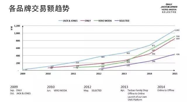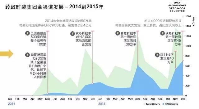 绫致赶上了好时机,从2009年开始就参加了淘宝的“双11”活动。到2011年,绫致旗下三个品牌活动当日销售额达5662万元,2014年,四个品牌总成交额升至2.08亿元。电商渠道既可以清掉此前积压的库存,也可以逐步打通线上线下。