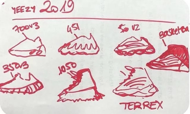 在草图中我们可以看到 Yeezy Boost 350 V3、Yeezy 451、Yeezy 500 V2、Yeezy 700 V3、Yeezy 1050 和一双 Terrex 户外系列,另外还有一双似乎看起来是篮球鞋。