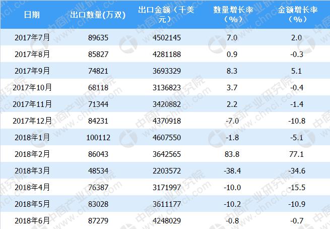 数据来源:中商产业研究院整理2017年7月-2018年6月中国鞋出口情况一览表