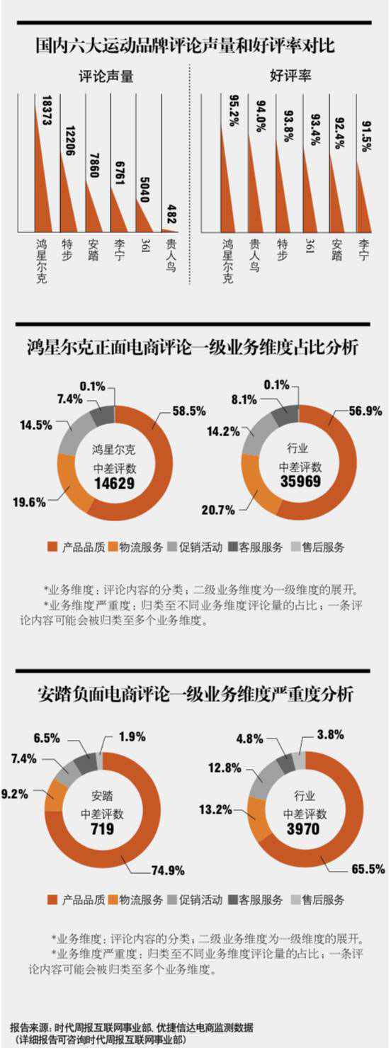 近日,时代周报互联网事业部联合优捷信达电商监测数据共 同策划,从评论声量以及评论内容等多个角度出发,挑选出安踏、李宁、361、鸿星尔克、特步、贵人鸟6个国内主要运动鞋品牌,采集 各品牌在2018年6月26日7月18日期间、于天猫和京东的官 方旗舰店或专卖店的相关数据, 评出网购反馈及口碑最佳的运动 鞋品牌。其中该报告监测的维度划分为一级业务维度和产品品质二 级业务维度。前者包括产品品质、客服服务、物流服务、促销活动和售后服务 ;后者包括质量 / 做工、异味、假货、磨脚、规格尺寸差异 和透气等。