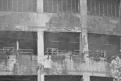 厂房外立面已被烧得变形,瓷砖大量脱落。