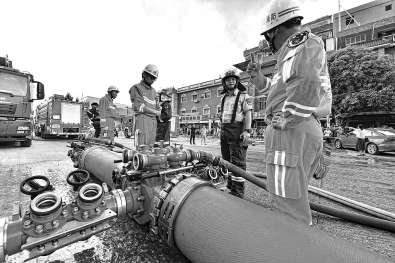 消防队员正在操作大口径供水系统,保障火场灭火水量。