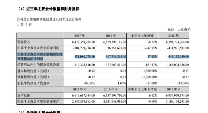 更值得注意的是,美特斯邦威近三年来,公司归属于上市公司股东的扣除非经常性损益的净利润(即扣非净利润)的这一项指标竟都是亏损的状态。自2015年到2017年,美特斯邦威扣非净利润分别为亏损4.45亿元亏损5.18亿元以及亏损3.21亿元,亏损总额度高达12.84亿元。
