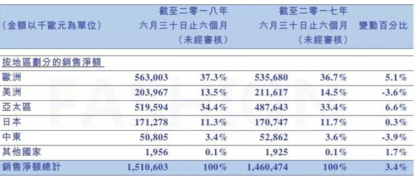 日本地区销售额仅增长0.3%至1.71亿欧元;