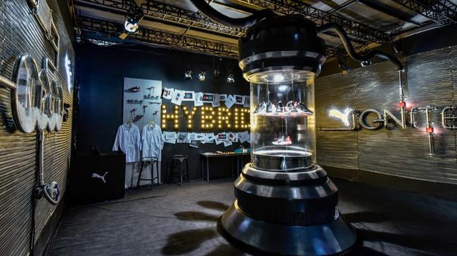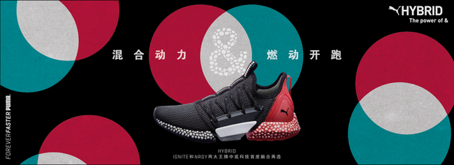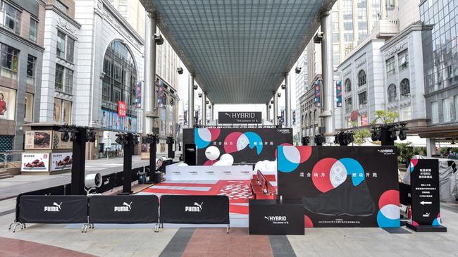 在PUMA HYBRID跑鞋发布活动上,为了让跑者更直观的体验到HYBRID跑鞋混合式中底科技带来前所未有的缓震及舒适脚感,PUMA打造了HYBRID快闪体验站,黑、白、红三段式设计的灵感来源于HYBRID Rocket跑鞋的中底设计——黑色的“引擎实验室”以汽车的引擎和气缸元素设计装点,强调HYBRID化身跑者脚下引擎的概念。白色“混合动力空间”的设计灵感来源于融合成HYBRID的IGNITE泡棉和NRGY能量球中底科技,体验者可以脱鞋后踩在模拟HYBRID中底材质的定制空间里,感受脚下安装引擎带来的缓震和能量反馈。红色为主调的“燃动开跑区”以大面积的红色跑道元素进行装点,嘉宾在现场即可完成试穿及试跑体验。