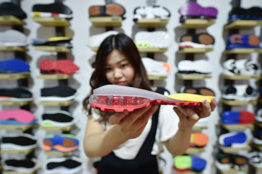在福建晋江国际鞋纺城,一家鞋底生产企业的销售人员在展示自主研发生产的气垫鞋底。