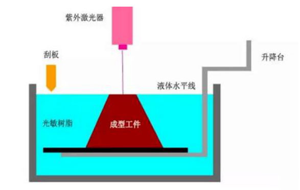 接下来,我们来看看这款SLA光固化3D打印机的成型原理:当激光聚焦到液态光敏树脂表面并使之凝固,便可完成第一层的打印作业;随后升降台下降一个分层厚度,树脂材料流过固化层,但由于自身高粘性,很难在短时间内迅速流平;彼时刮板根据预先设定的分层厚度作前、后往复运动,以保障液面厚度均匀;接着激光再对新一层液态光敏树脂进行扫描固化,这样层层叠加直到打印完成。