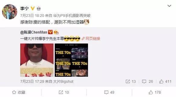 在微博上,他也开始和时尚界人士互动,以打造时尚大片闻名的摄影师陈漫,贴出了她镜头下穿着李宁服饰的李宁,李宁转发并评论:“潮的不用加湿器。”