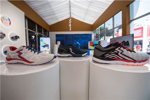 361°“热爱之家”产品摆放区展示了三款主打国际线专业跑鞋