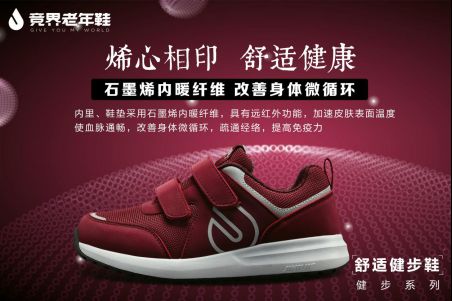 竞界老年鞋18年秋冬新品围绕着“科技、舒适、健康、专业、环保、时尚”主题,针对老年人脚型特点,加宽、加高鞋面,增加鞋子舒适性;同时,在防滑、缓震等基础功能方面精雕细琢。新品内里、鞋垫采用石墨烯内暖纤维,具有远红外功能,加速皮肤表面温度,使血脉通畅,改善身体微循环,疏通经络,提高免疫力。从产品设计、工艺的创新升级、到功能性等每一个环节,竞界老年鞋都力臻完美,创造非同凡响的穿着体验,不断引领着行业发展的变革