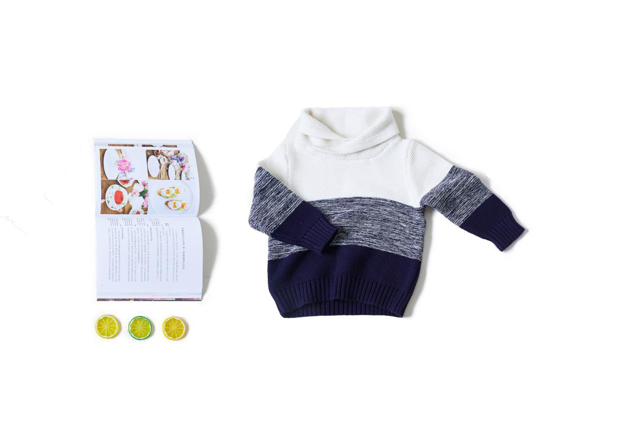 趣籍新款拼接色毛衣采用时尚白灰蓝色块拼接,单穿、内搭皆可。这款毛衣在领子上做了修改,将常见的衣领改成了加帽款,严肃的条纹色块毛衣瞬间萌萌哒。让孩子穿上,保暖的同时时尚不失可爱,秒变温暖小绅士。