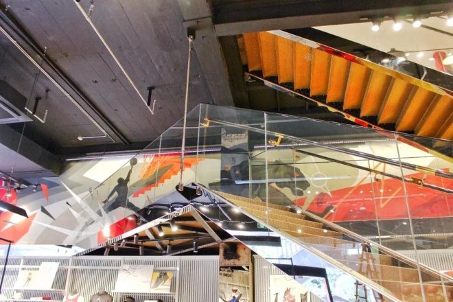 在门店设计方面,这家Jordan旗舰店别出心裁。连接楼层的廊桥由插画师为杭州独家定制特殊涂鸦,还有一面墙展示了AIR JORDAN 1-32代全系列的球鞋,可谓是这家旗舰店的“镇店之宝”。