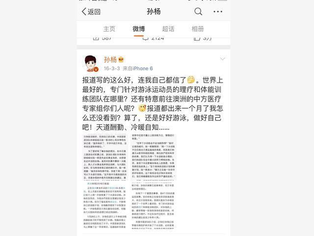 彼时,国家游泳中心曾说派中方医疗团队前往澳洲帮助孙杨恢复。但从孙杨2016年3月3日的微博来看,显然这样的团队并不存在。孙杨也在微博里抱怨了几句,显示了自己的不满。