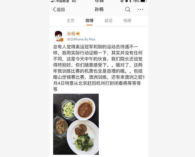 孙杨2年前微博曝不穿安踏原因!疗伤自己出钱 伙食看了让人心疼