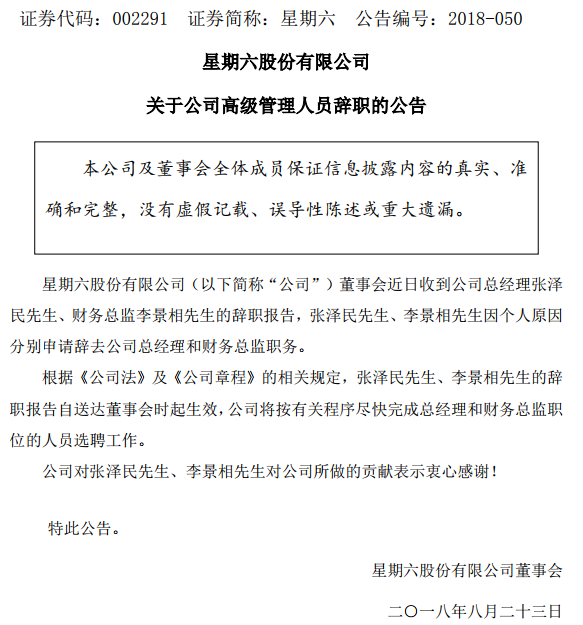 星期六高管变动:总经理张泽民、财务总监李景相离职