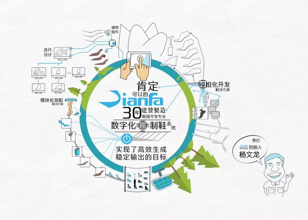 由动画视频中,我们可清楚的窥见{数字化制鞋之模组化开发}的技术应用可涵盖大、中、小型企业,数据库的建立与其背后的技术支援,将改变制鞋产业的量产型生态。